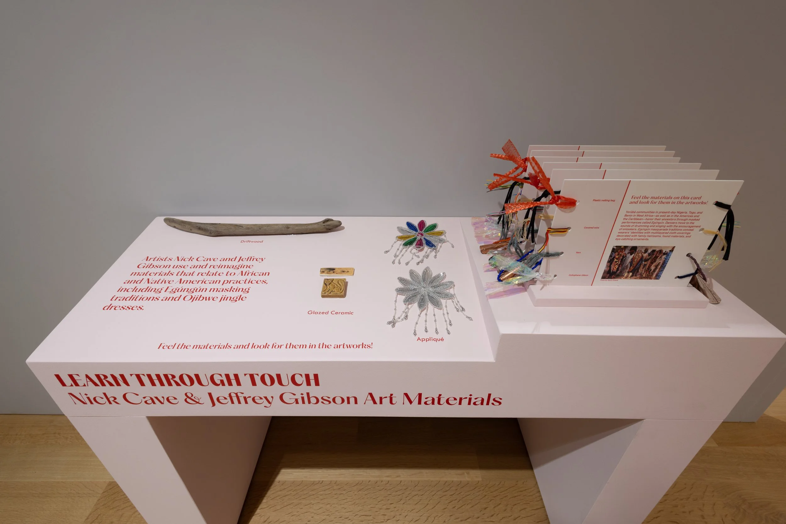The touch table is an interactive and tactile didactic that allows visitors to explore the materials and sounds of Jeffrey Gibson's and Nick Cave’s sculptures, enhancing engagement while preserving the original artworks.